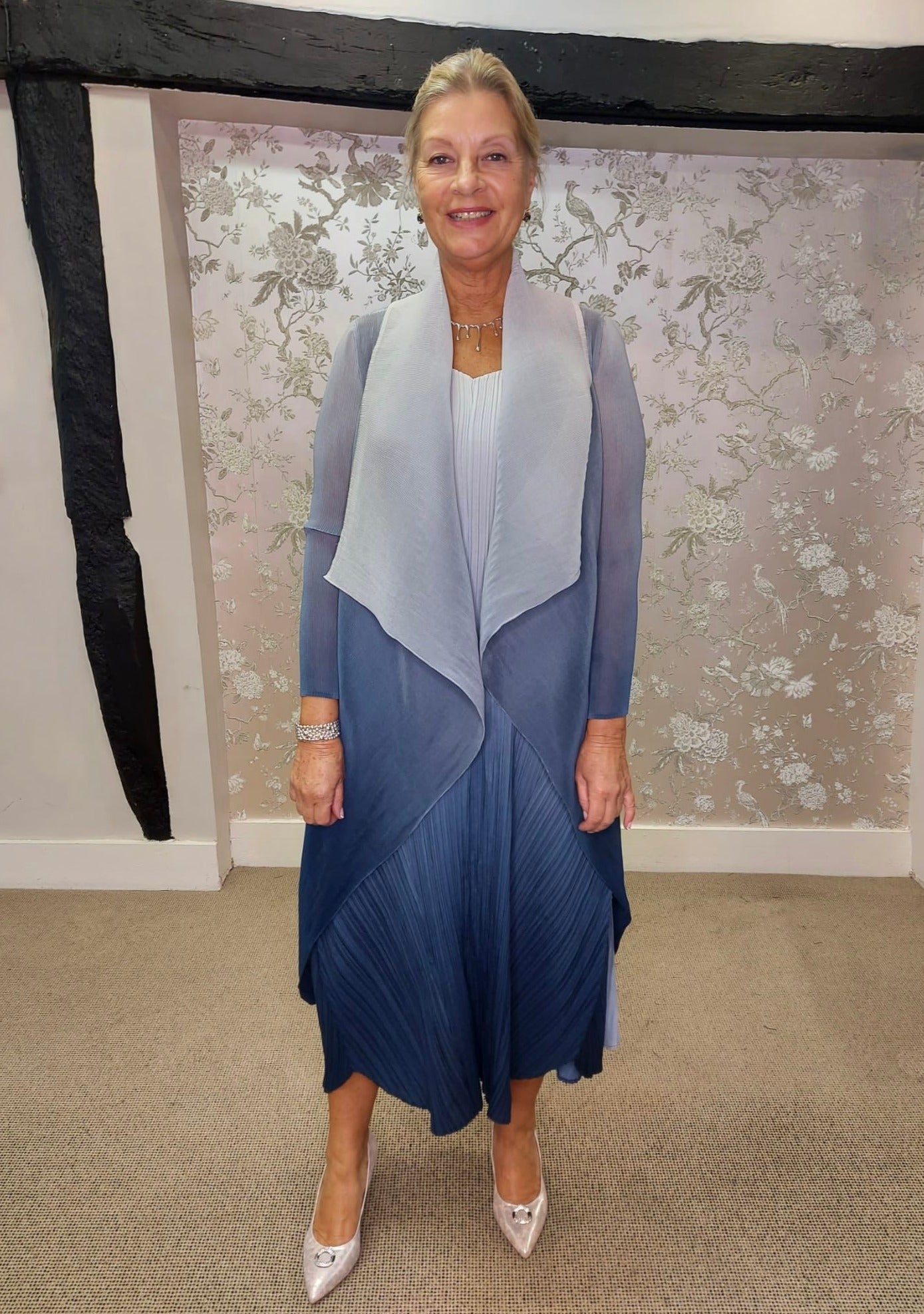 Get ready to turn heads in the Alquema estrella dress & jacket in Marshmallow & Indigo! The super lightweight fabric and beautiful ombre colour will make you feel effortlessly stylish. The jacket's waterfall collar and the dress's tulip shape and v-neck add a touch of elegance. Perfect for weddings abroad or a day at the races!