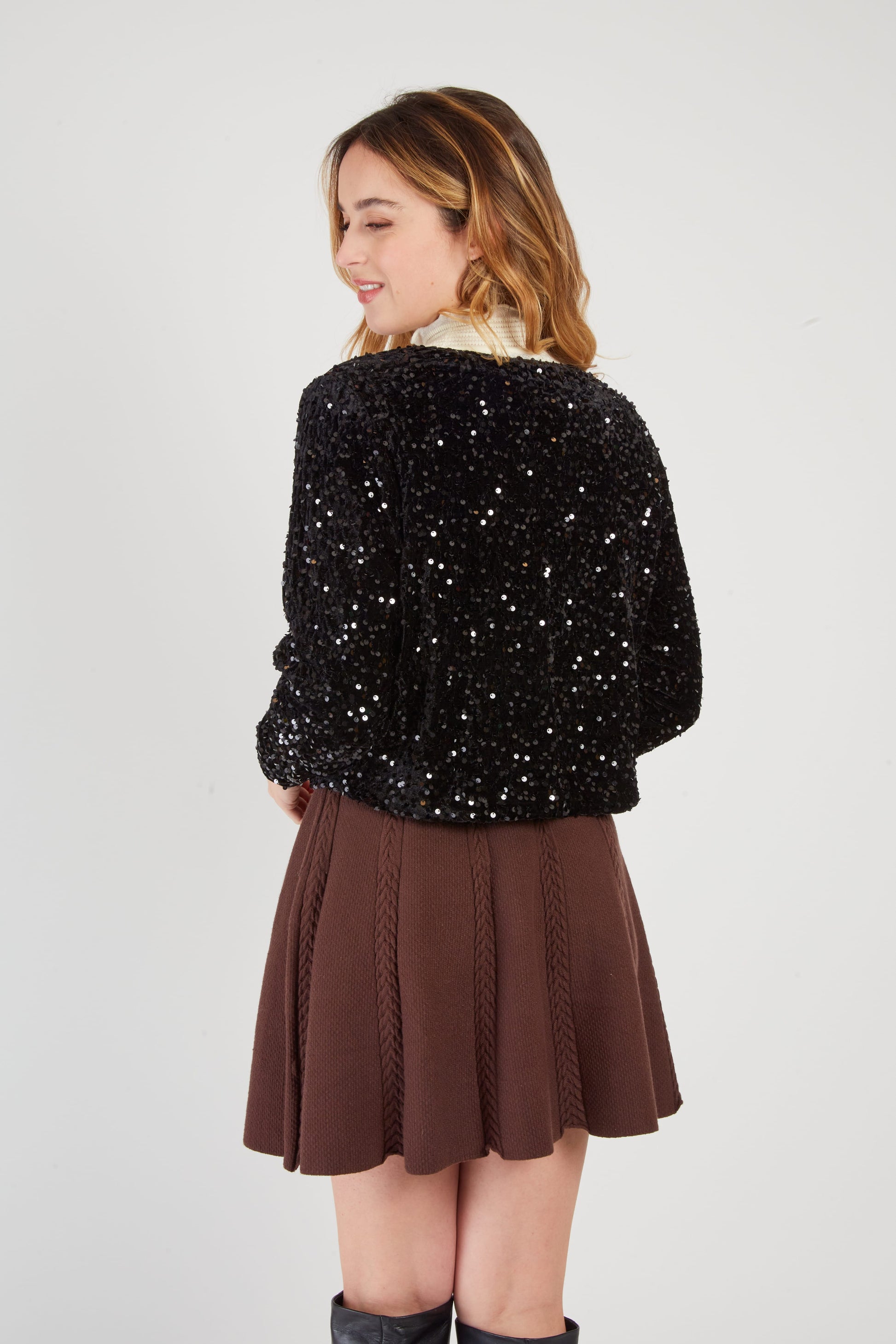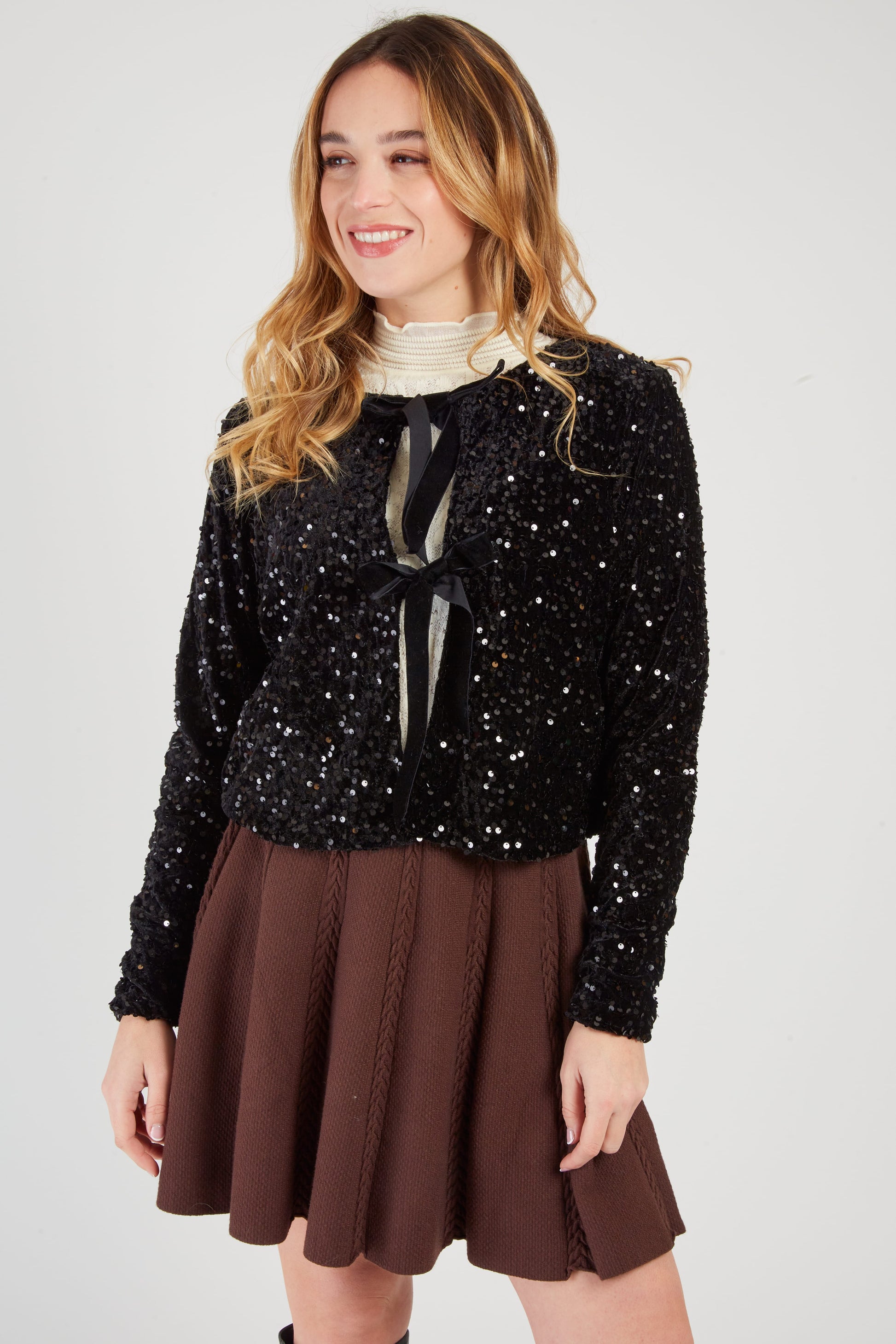 Elevate your wardrobe with the Derhy Black Cardigan. This short, long-sleeved jacket features a stylish round neck and a convenient drawstring at the neckline for a customisable fit. Adorned with shimmering sequins, it adds a touch of sparkle to any outfit, making it perfect for both casual and evening wear. Comfortable and chic, it’s a versatile piece that effortlessly enhances your style.