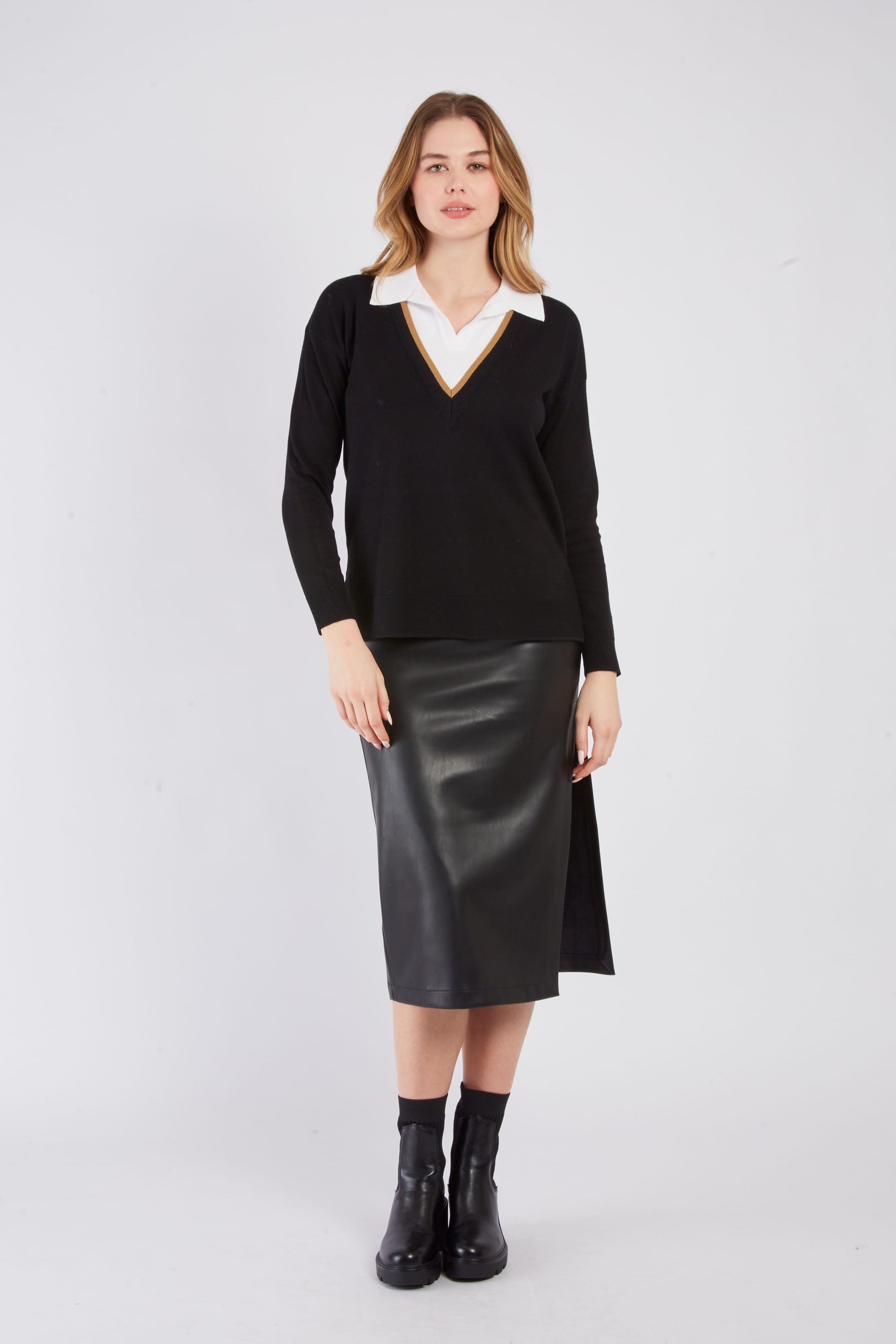 This Derhy Black Sweater combines soft knit comfort with refined details for a stylish look. Featuring fine ribbing and an inset shirt collar, it offers a chic layered effect without the bulk. The long sleeves and straight cut ensure a flattering, comfortable fit, perfect for elevating your casual wardrobe with effortless sophistication.