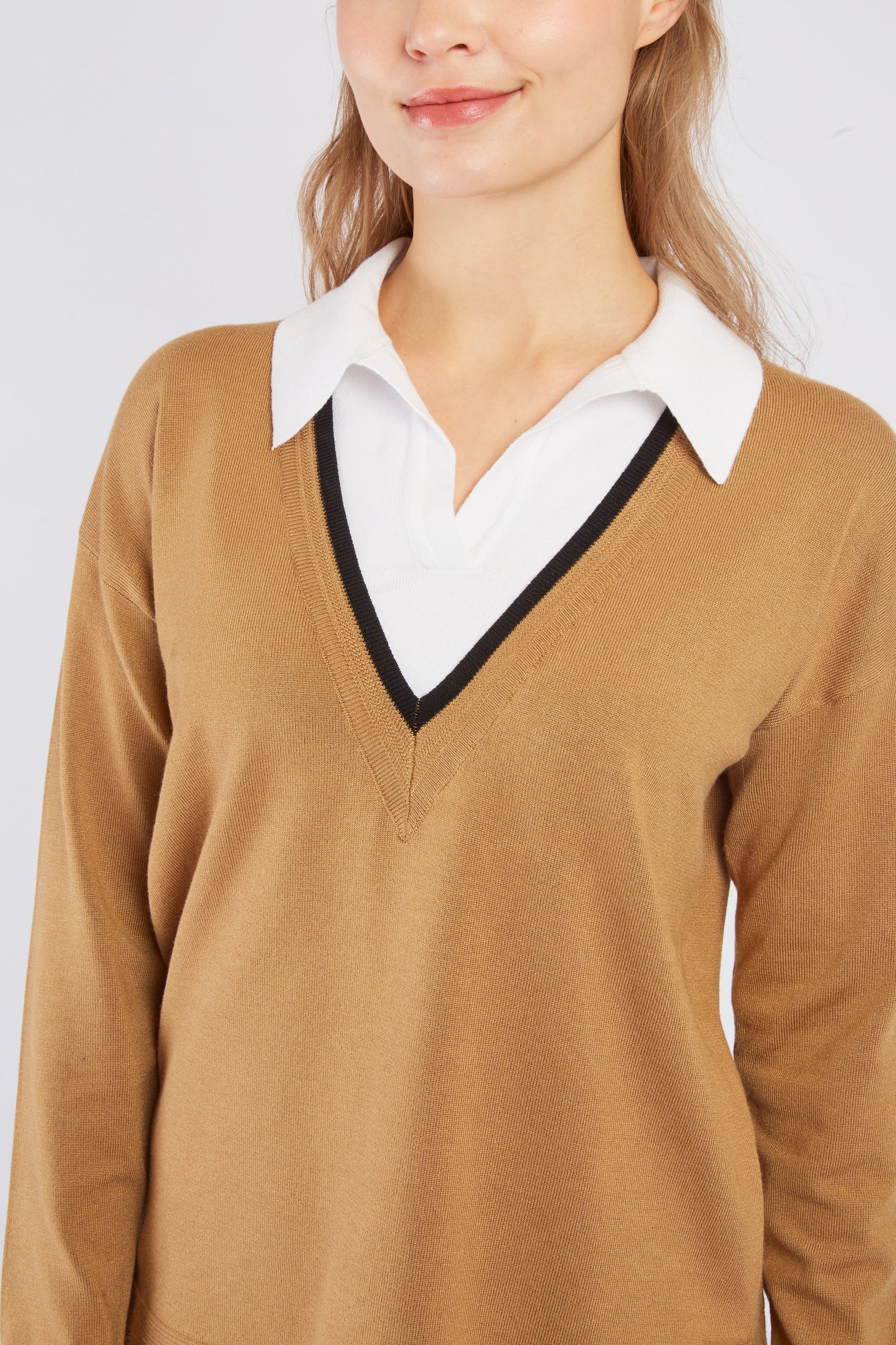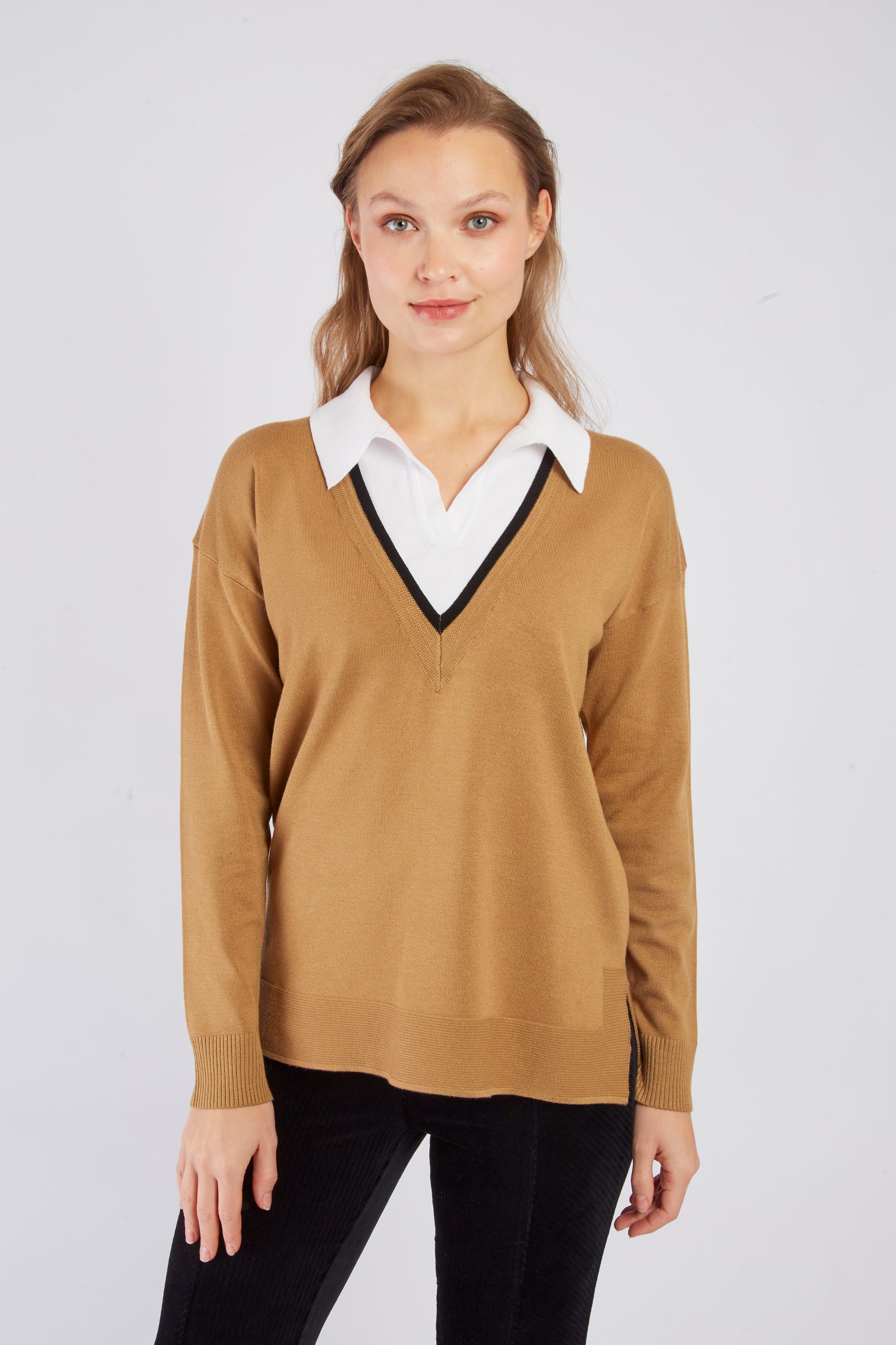 This Derhy Camel Sweater combines soft knit comfort with refined details for a stylish look. Featuring fine ribbing and an inset shirt collar, it offers a chic layered effect without the bulk. The long sleeves and straight cut ensure a flattering, comfortable fit, perfect for elevating your casual wardrobe with effortless sophistication.