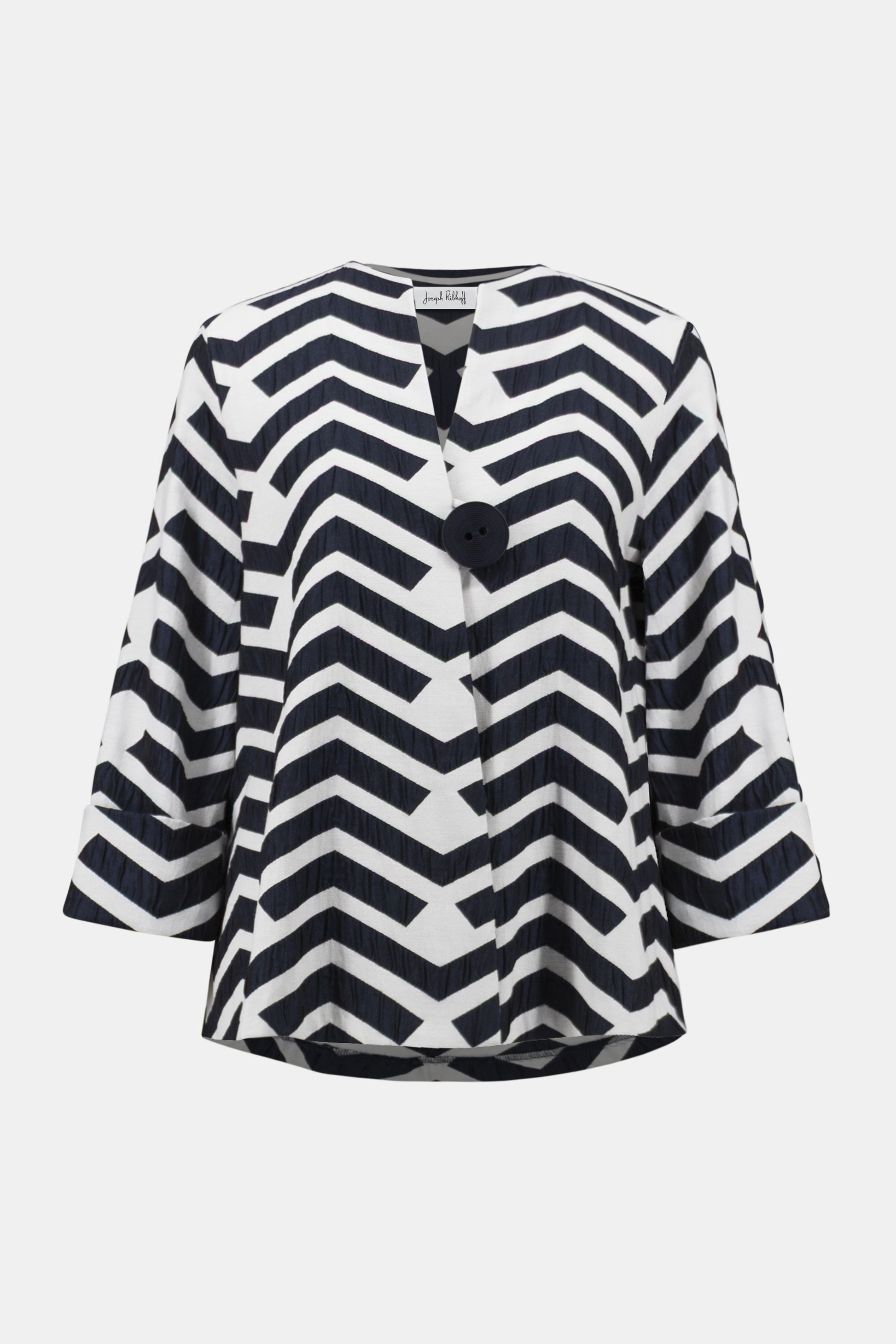 Elevate your wardrobe with this striking Joseph Ribkoff Crinkle Jacket, where contemporary design meets tactile appeal. The jacquard weave showcases a bold geometric pattern that commands attention, while the crew neckline offers timeless sophistication. Three-quarter cuffed sleeves provide versatile styling options for any season, and distinctive statement buttons add an unexpected touch of refinement. Perfect for those who refuse to blend in, this jacket transforms everyday outfits into fashion moments that reflect your confident, individual style.