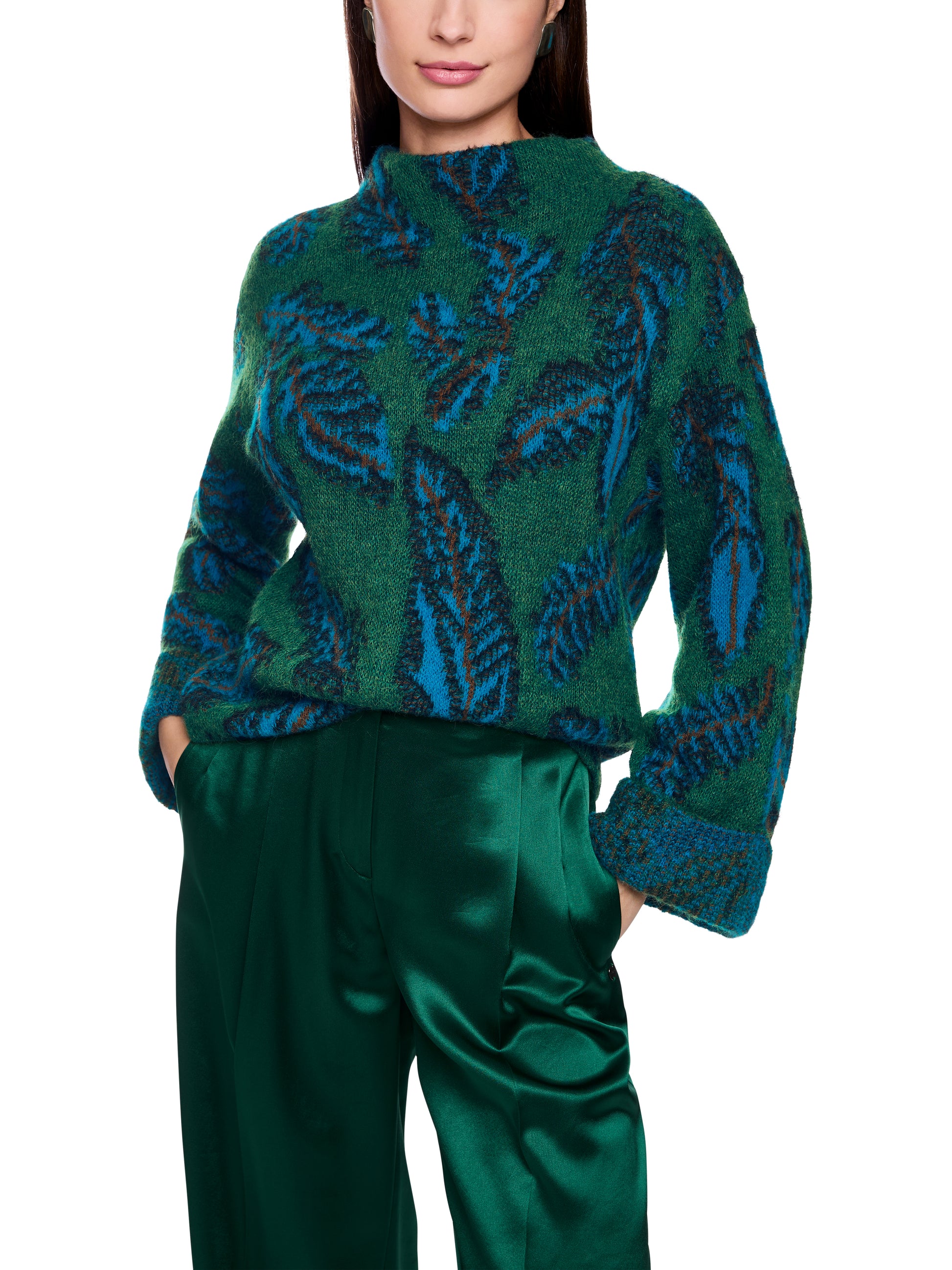 This Marc Cain sweater features a soft alpaca wool blend jacquard knit with an elegant feather motif, offering warmth and sophistication. Its loose cut, wide sleeves, and subtle boat neck combine for a relaxed yet feminine silhouette, perfect for cooler days. Expertly knitted and finished in Germany, with further craftsmanship by European partners, this jumper delivers quality and style in every stitch. Elevate your wardrobe with this timeless, comfortable statement piece.