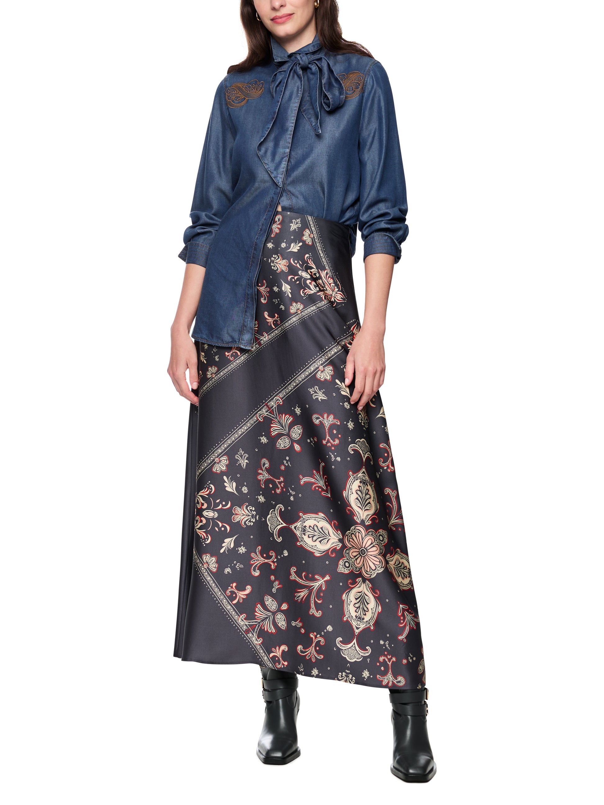 Elevate your wardrobe with this sophisticated denim blouse, crafted from premium Lyocell (TENCEL™) for exceptional comfort and sustainability. The loose-fitting silhouette features a charming bow detail and concealed buttoning for a refined aesthetic, while elegant single-button cuffs add polish. Intricate embroidered paisley motifs and subtle mini studs create eye-catching accents that set this piece apart. Certified with the 'Rethink Together' sustainability label, you can feel confident knowing you're choosing responsible fashion without compromising on style or quality.