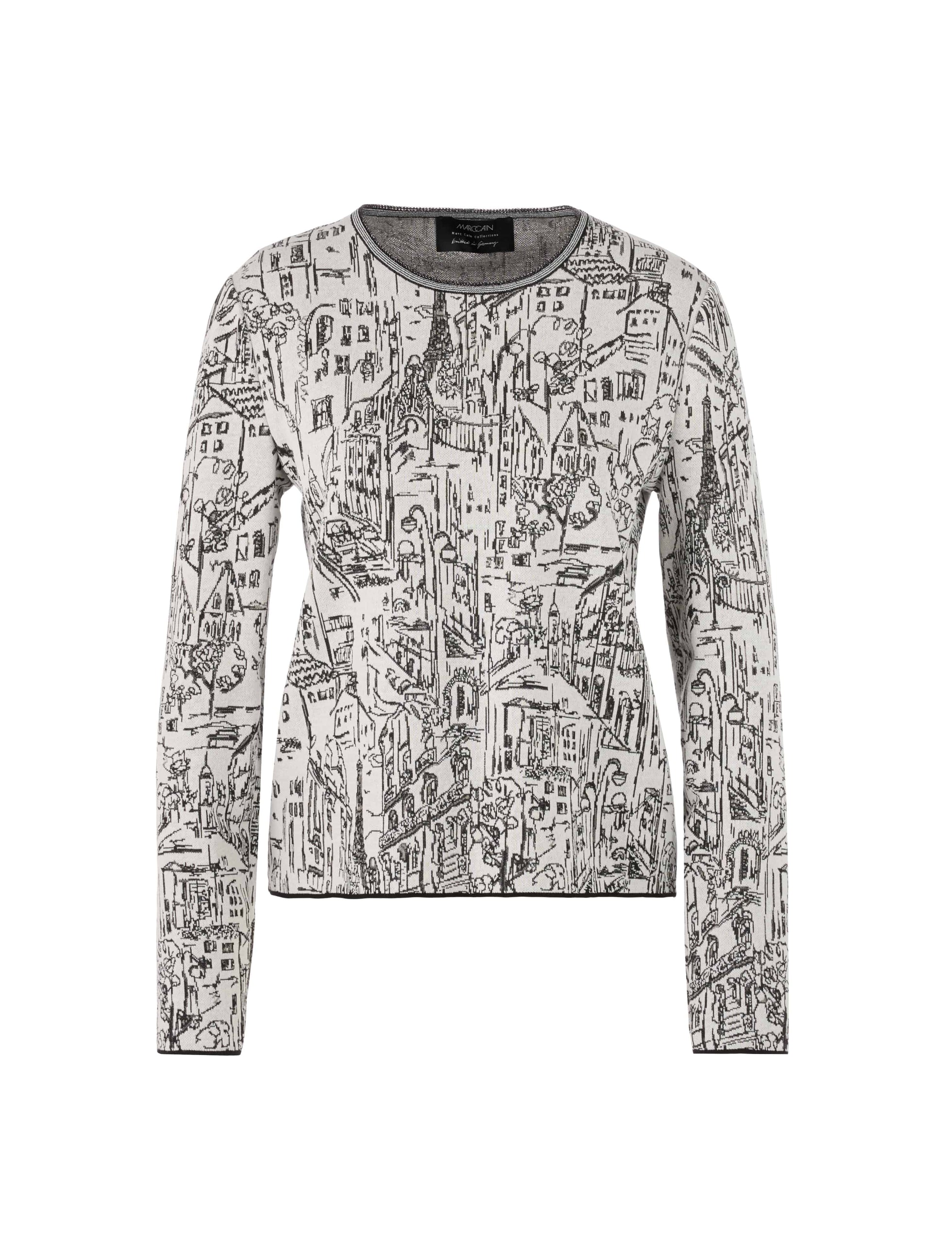 This slim-fit fine knit jumper by Marc Cain combines comfort and style, crafted from a soft viscose-cotton blend for a smooth, breathable feel. Featuring a modern CITY motif in a hand-scribbled design, it adds a fresh urban touch to your wardrobe. With a round neck and long sleeves, this narrow-cut sweater is expertly knitted and finished in Germany, then completed by European partners, ensuring high-quality craftsmanship. Ideal for elevating everyday looks with a contemporary edge.