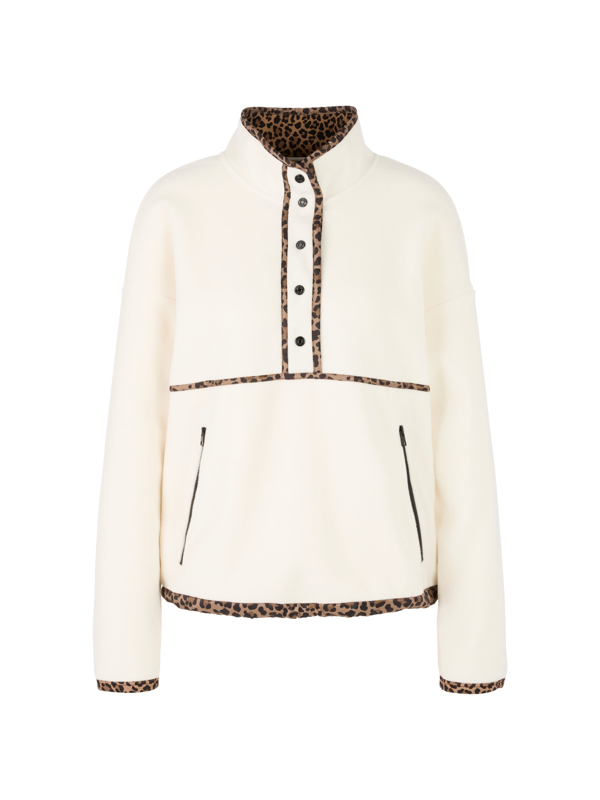 Stay cozy and stylish with the Marc Cain Sports Fleece Sweater. Crafted from a warm polyester-cotton blend, this straight-cut jumper features a stand-up collar and convenient press stud buttoning. Two zippered side pockets provide secure storage, while the leopard print accents on the inner collar and waistband edge add a chic, fashionable detail. Perfect for chilly days, this fleece combines practicality and trend-forward design effortlessly.