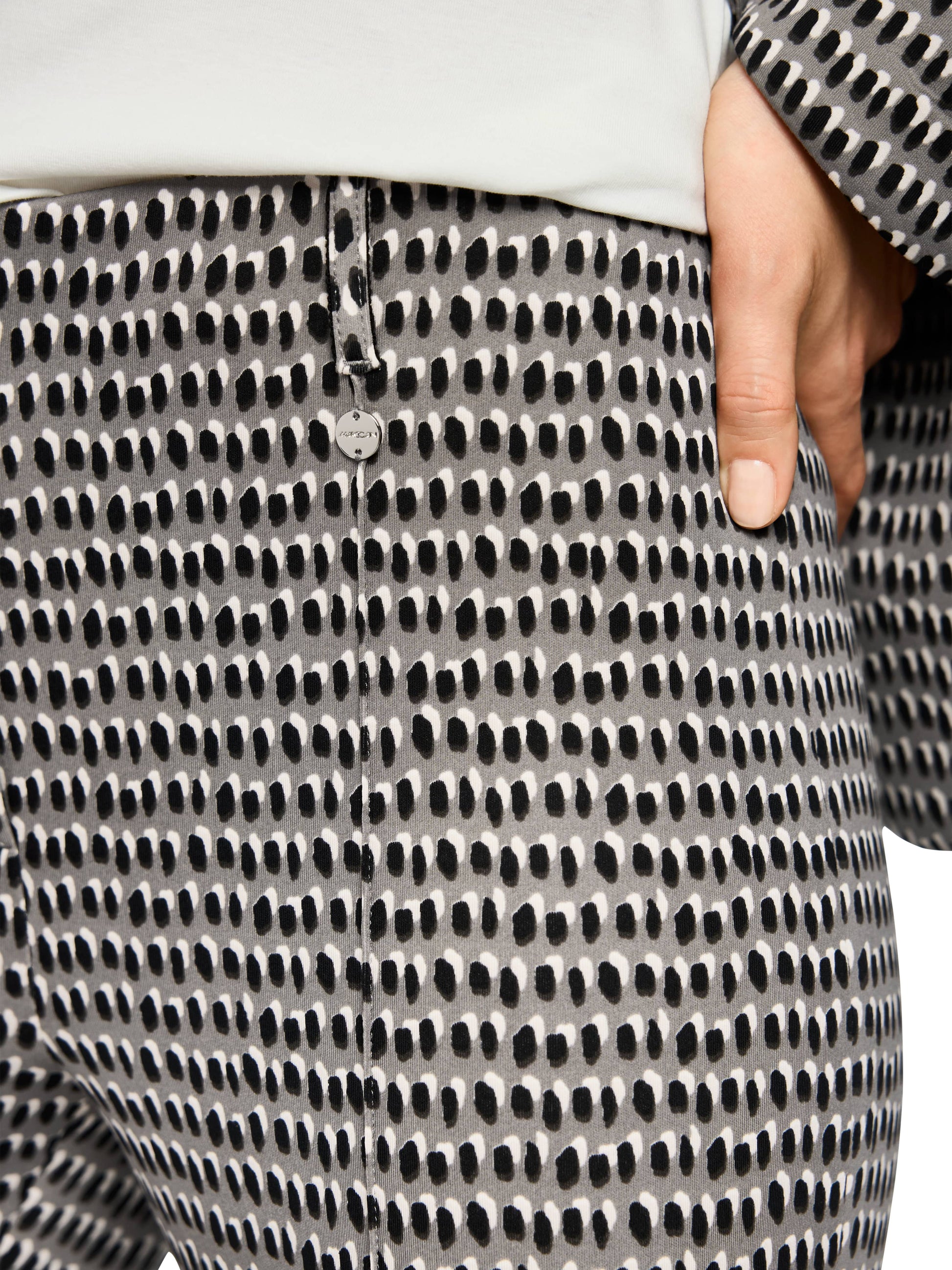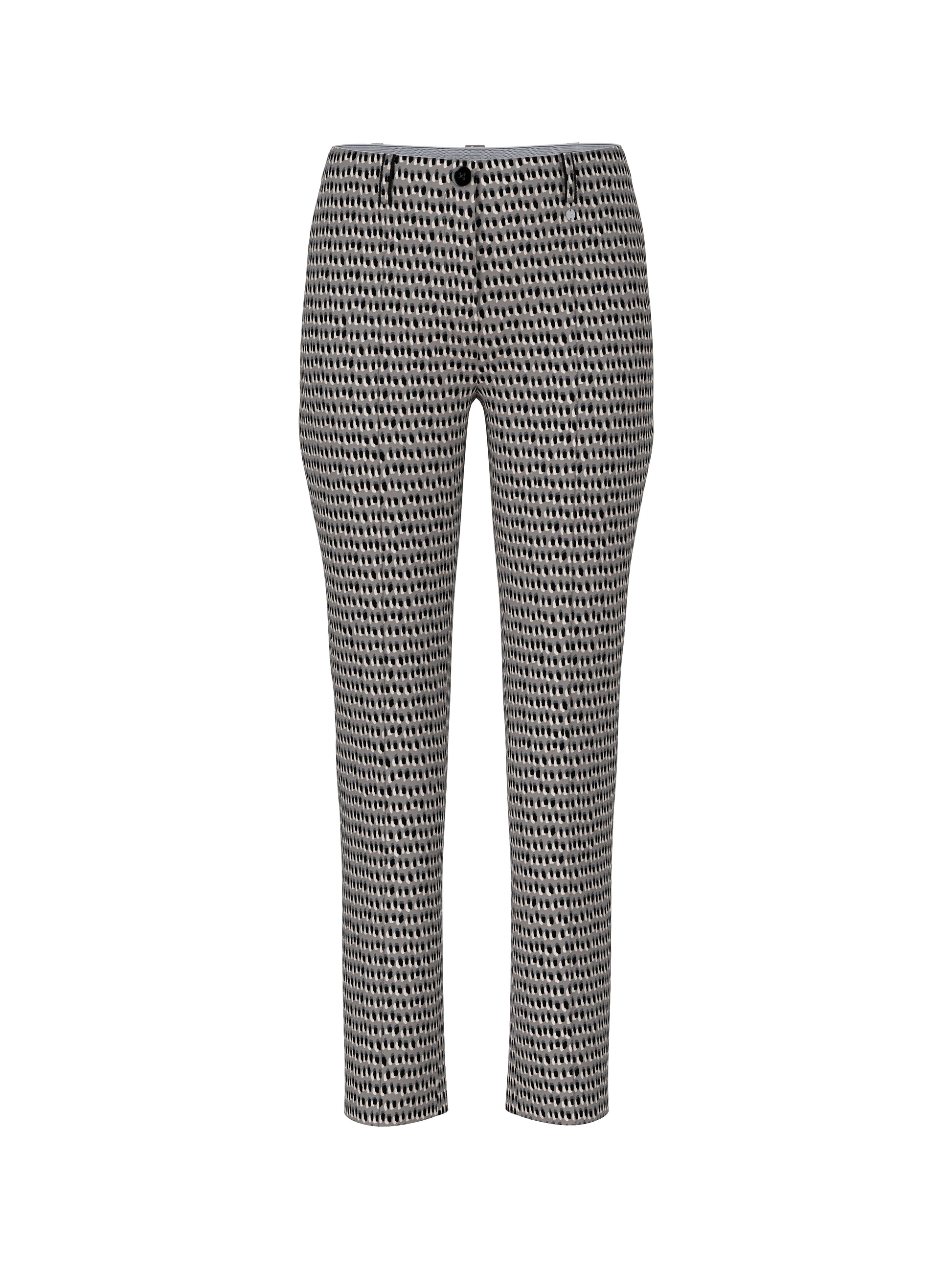 The Marc Cain Sprinkles Trousers combine sleek style with playful charm through their unique all-over sprinkles print. Crafted from soft scuba jersey, these slim-fit trousers feature a regular waist, button, zip, and belt loops to ensure a comfortable, tailored fit. Perfectly suited to elevate any modern wardrobe, they measure 28" leg length and promise both comfort and individuality in your outfit. Ideal for those seeking a chic, distinctive look.