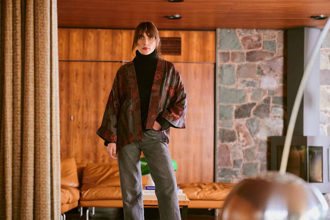The One Hundred Stars Pagoda Kimono showcases a striking giant pagoda and tree design with a mirror image, set on a distinctive grey pewter base accented by rust and charcoal hues for an authentic ‘Spitalfields’ effect. Crafted with loose ¾ length sleeves, an open front, and a subtly embroidered lapel, this bestselling kimono pairs effortlessly with a matching camisole and jeans for summer, or layers perfectly over a polo neck during cooler seasons. Elevate your wardrobe with versatile style and timeless elegance.