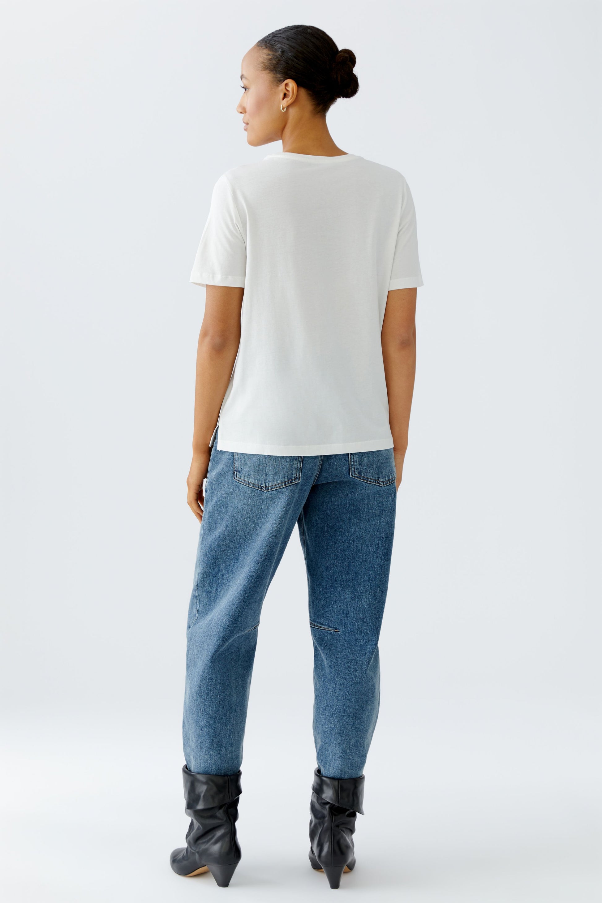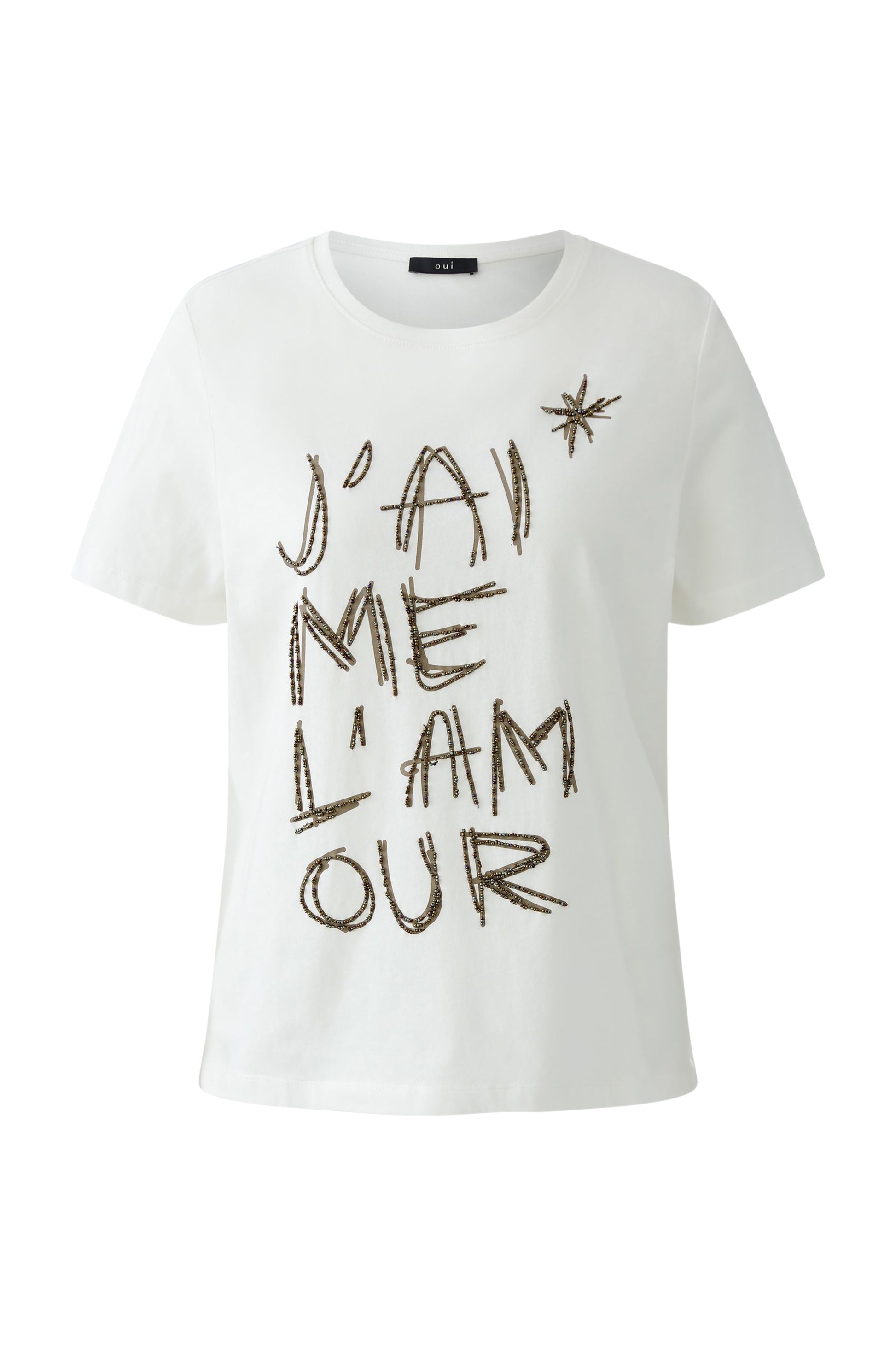 This Oui Beaded T-Shirt combines understated elegance with comfortable wear. Crafted from pure organic mercerized cotton, it features hand-applied tonal beads and sequins that add subtle shimmer and texture. Designed with a casual cut, round neck, and short sleeves, it offers easy, everyday style. Side slits enhance movement and comfort, making this piece as practical as it is refined. Perfect for elevating your casual wardrobe with a touch of artisanal detail.
