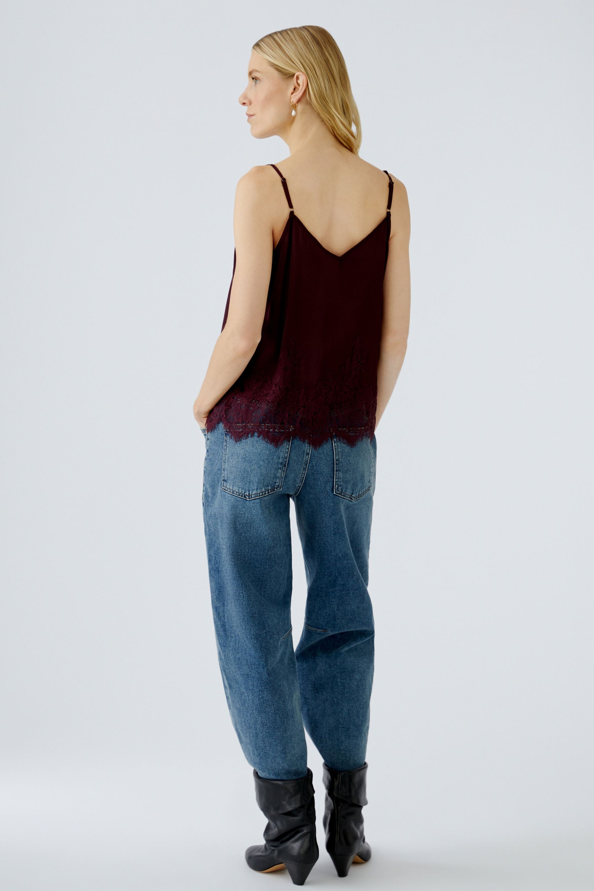Elevate your layering game with the Oui Berry Camisole, crafted from smooth satin and adorned with delicate hand-cut lace at the neckline and hem. Its straight cut and flattering V-neck, front and back, enhance your silhouette while adjustable satin spaghetti straps ensure a perfect fit. Ideal beneath cropped pullovers, this camisole adds a touch of elegance and subtle allure to your everyday wardrobe.