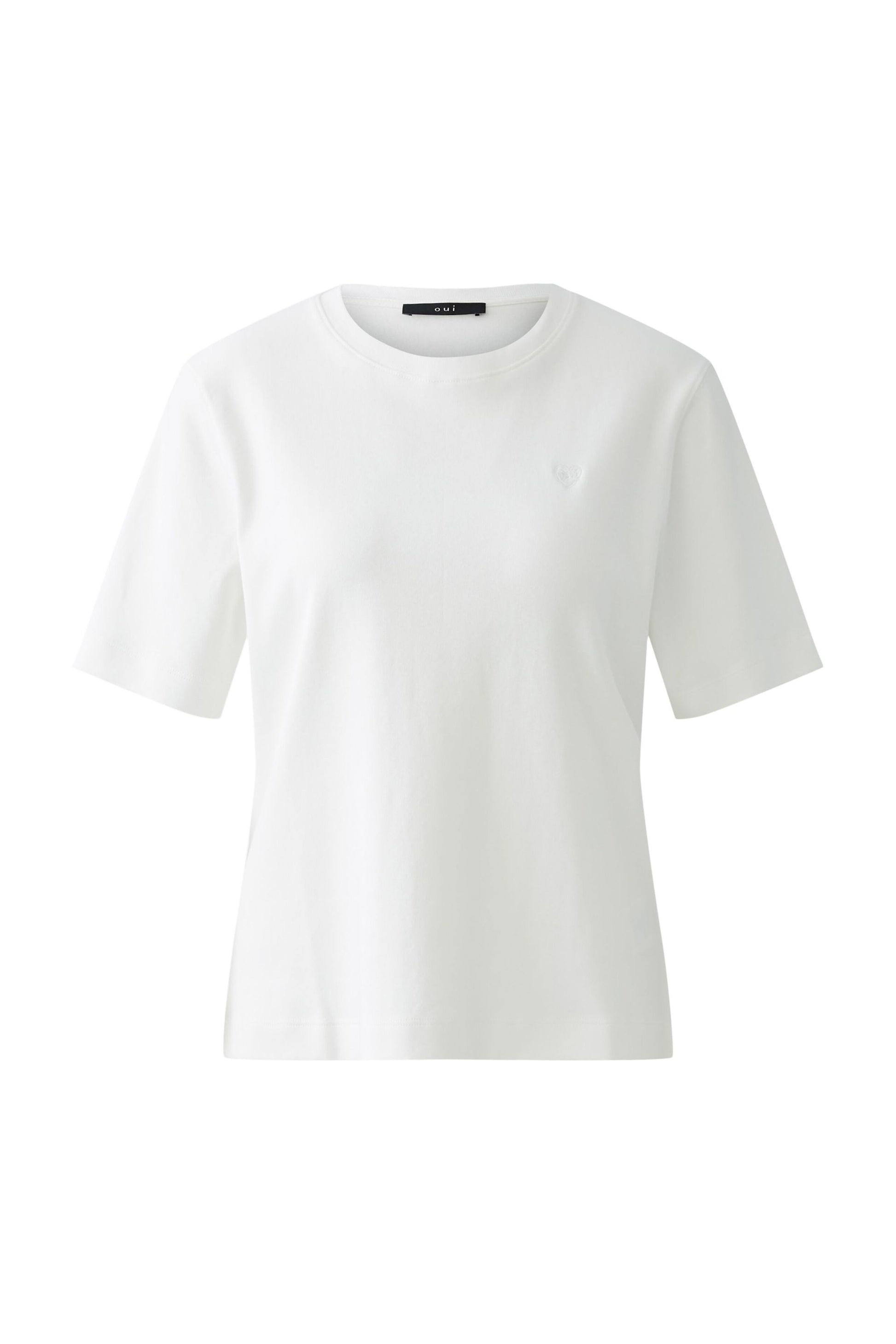 The Oui Cream Firm Knit T-Shirt offers a refined blend of sporty style and feminine elegance. Crafted from soft, opaque pure cotton interlock, it provides comfort and a luxurious feel. Its straight cut and regular length ensure a flattering fit, enhanced by a ribbed round neckline and detailed sleeve seams. A subtle heart logo embroidery adds a delicate, sophisticated touch. Designed to run slightly large, consider sizing down for a tailored look. This T-shirt perfectly combines quality and understated charm for a versatile wardrobe staple.
