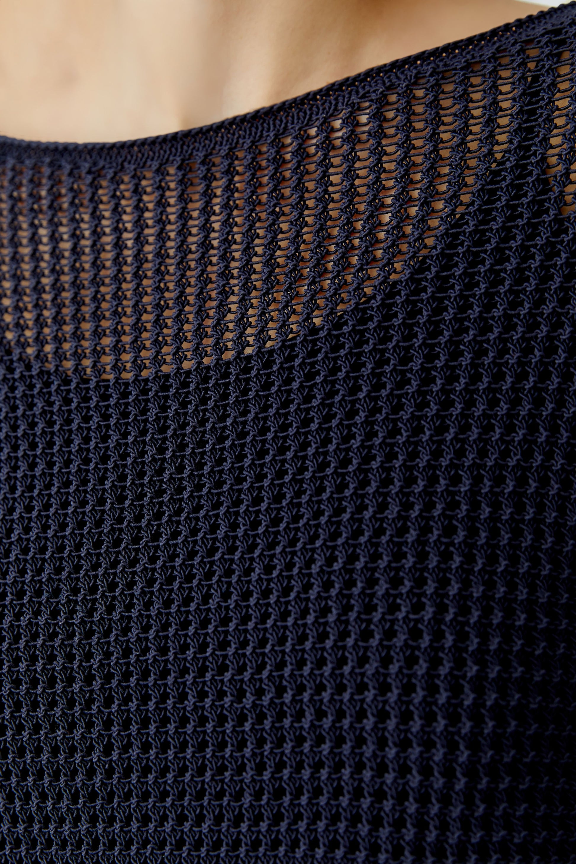 Elevate your warm-weather wardrobe with this effortlessly chic pullover. Crafted from a breathable cotton blend in an intricate net structure, it offers a delicate semi-transparent finish perfect for layering or wearing solo. The relaxed, shortened silhouette features a distinctive submarine neckline with a refined rolled edge, while slightly overcut shoulders create an easy, contemporary drape. Long sleeves with straight cuffs and a rolled hem complete the look—ideal for casual days when you want understated sophistication with modern edge.