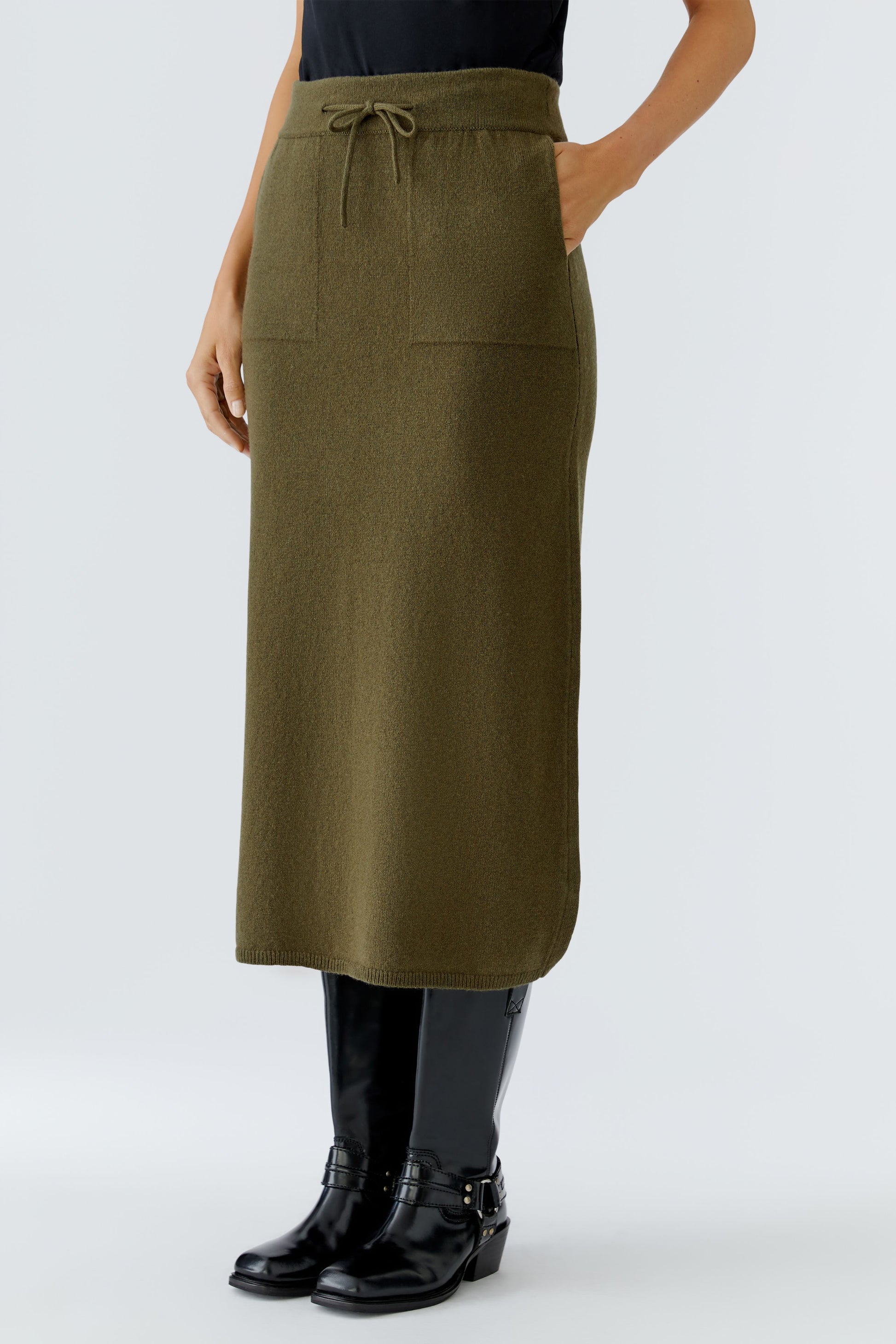 Experience effortless style with the Oui Knit Skirt, crafted from a soft wool blend with modal for exceptional comfort. This midi-length skirt features a straight cut and practical side pockets, perfect for a casual yet refined look. The knitted double waistband, reinforced with elastane and equipped with an integrated cord, ensures a secure and flattering fit. Fully reinforced for shape stability, this skirt maintains its form wear after wear. Ideal for everyday elegance, it combines comfort and functionality in one versatile piece.