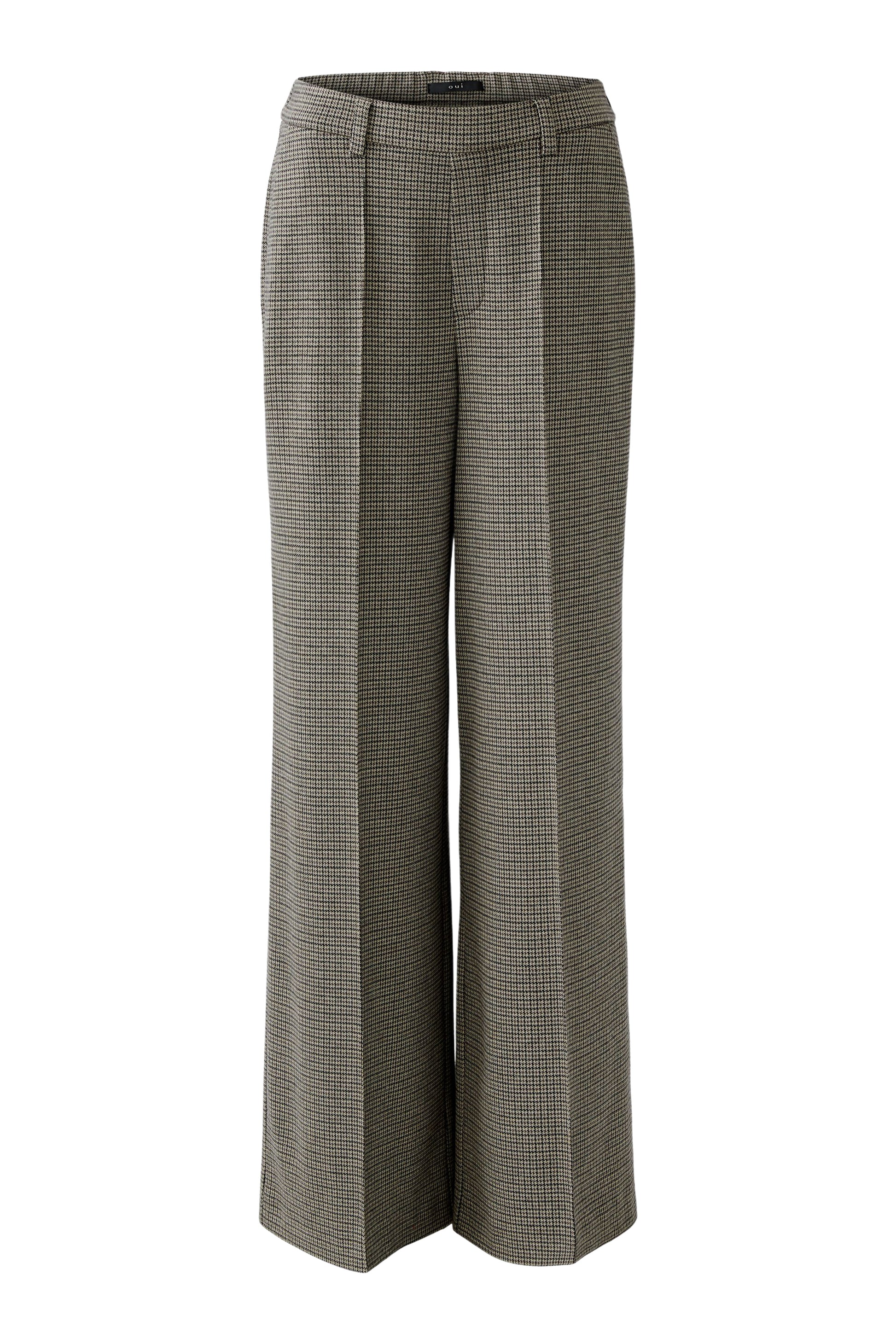Experience effortless style and comfort with these Oui Puppytooth Trousers. Crafted from soft jersey with viscose, their classic houndstooth pattern brings timeless elegance. The wide, straight leg and straight cut offer a flattering silhouette, while the comfortable waistband—elasticated at the back and smooth in front with a side zip—ensures a perfect fit. Practical side pockets and subtle back pocket details add functionality, and a fixed front piping creates a sharp crease for a polished finish. Ideal for both workdays and casual outings, these trousers combine style and ease in one.