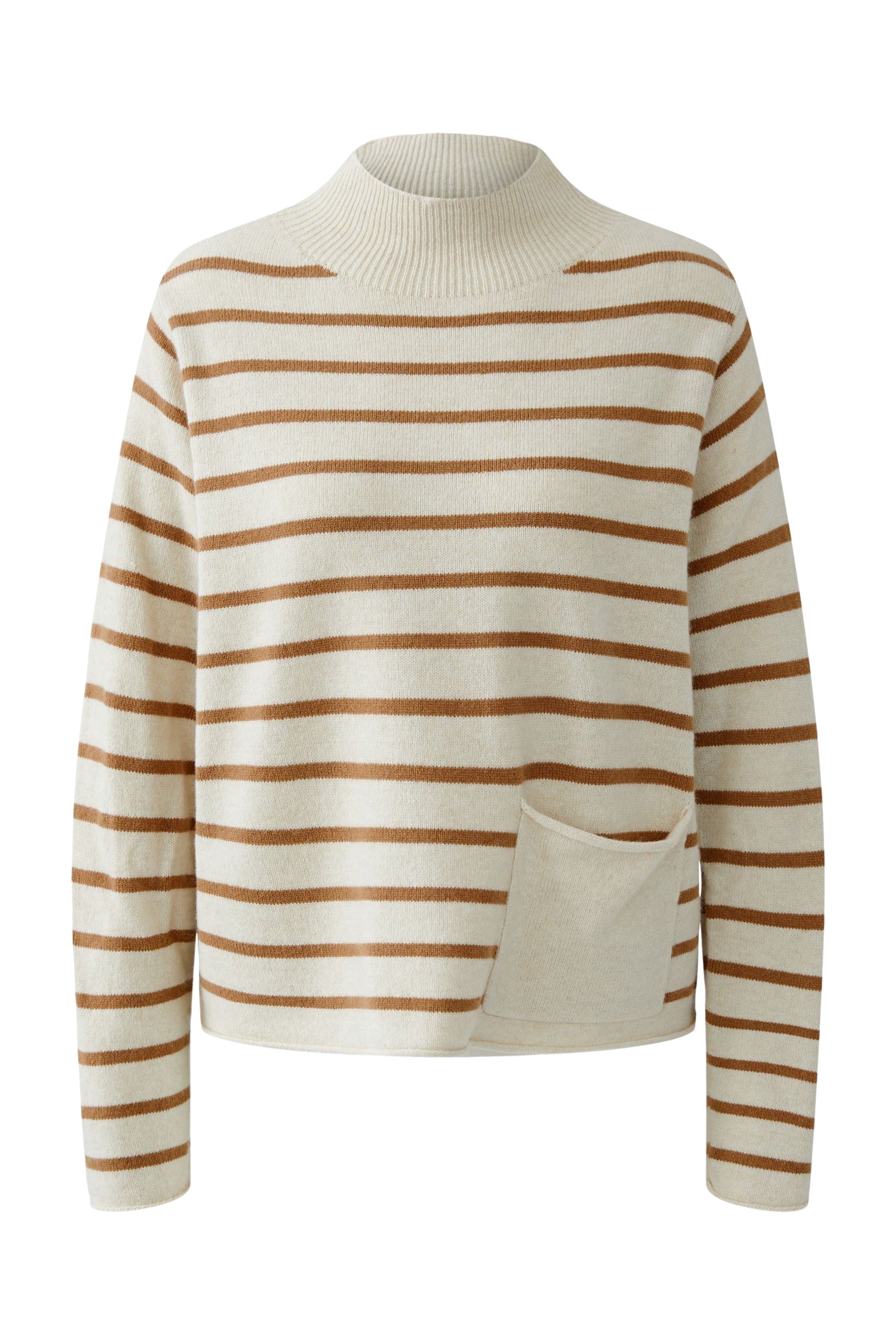 The Oui Stripe Sweater offers effortless style and comfort with its soft wool blend and smooth striped knit. Designed for a relaxed fit and regular length, it features a high stand-up ribbed collar and a contrasting patch pocket for a casual yet refined look. Finished with neat edge trims on the sleeves, hem, and pocket, this cozy pullover is perfect for everyday wear that stands out with subtle details.