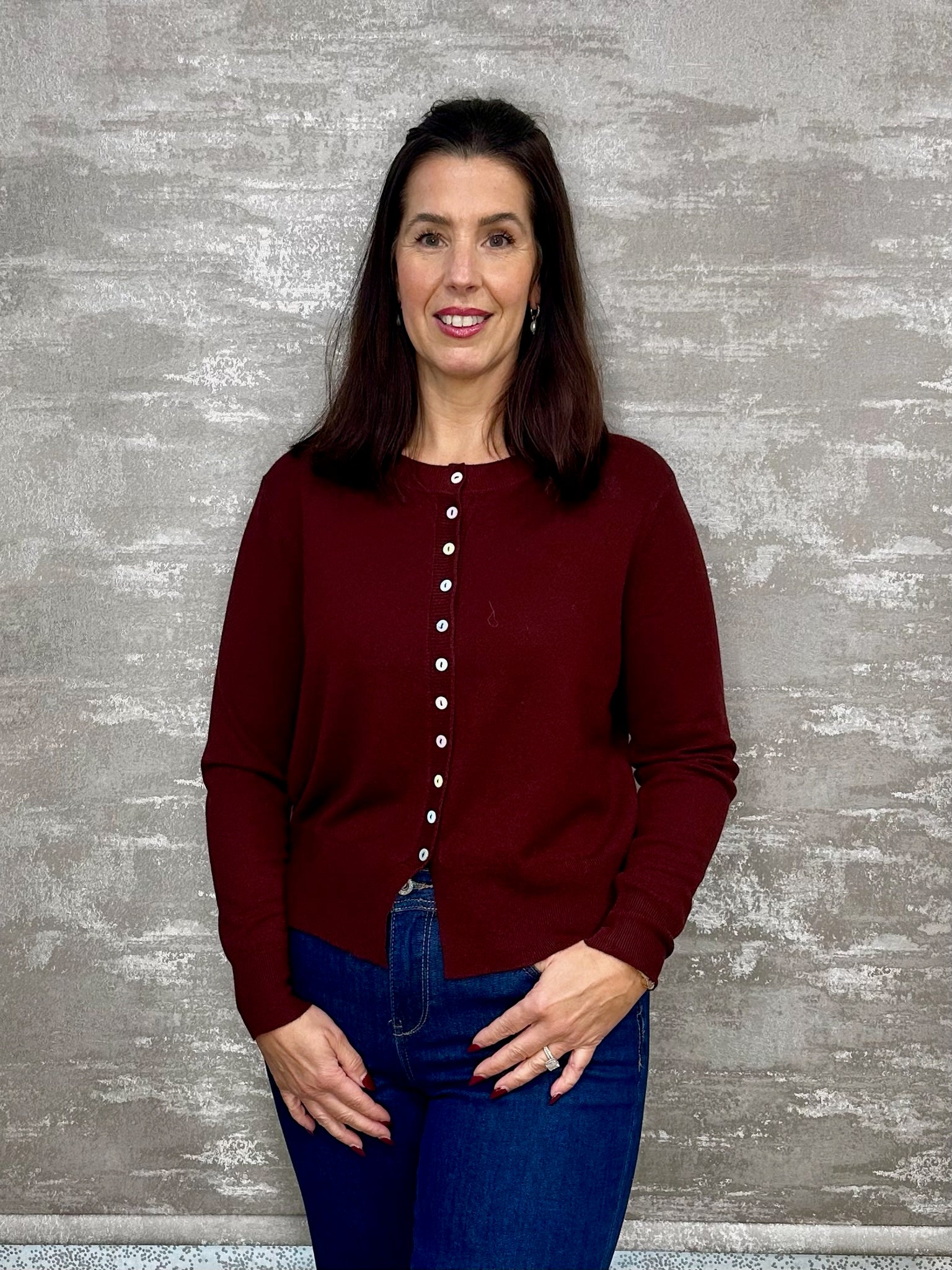 Elevate your everyday wardrobe with this sophisticated burgundy button cardigan, crafted for timeless style and versatility. The classic round neckline and flowing long sleeves create an effortlessly polished silhouette that transitions seamlessly from office to weekend. Soft, quality fabric drapes beautifully while the functional button front allows you to layer with ease or wear open as a chic outer piece. Perfect for layering over your favourite tops or wearing solo, this wardrobe essential delivers comfort without compromising on elegance. A burgundy hue that complements any complexion, making it the go-to piece you'll reach for season after season.