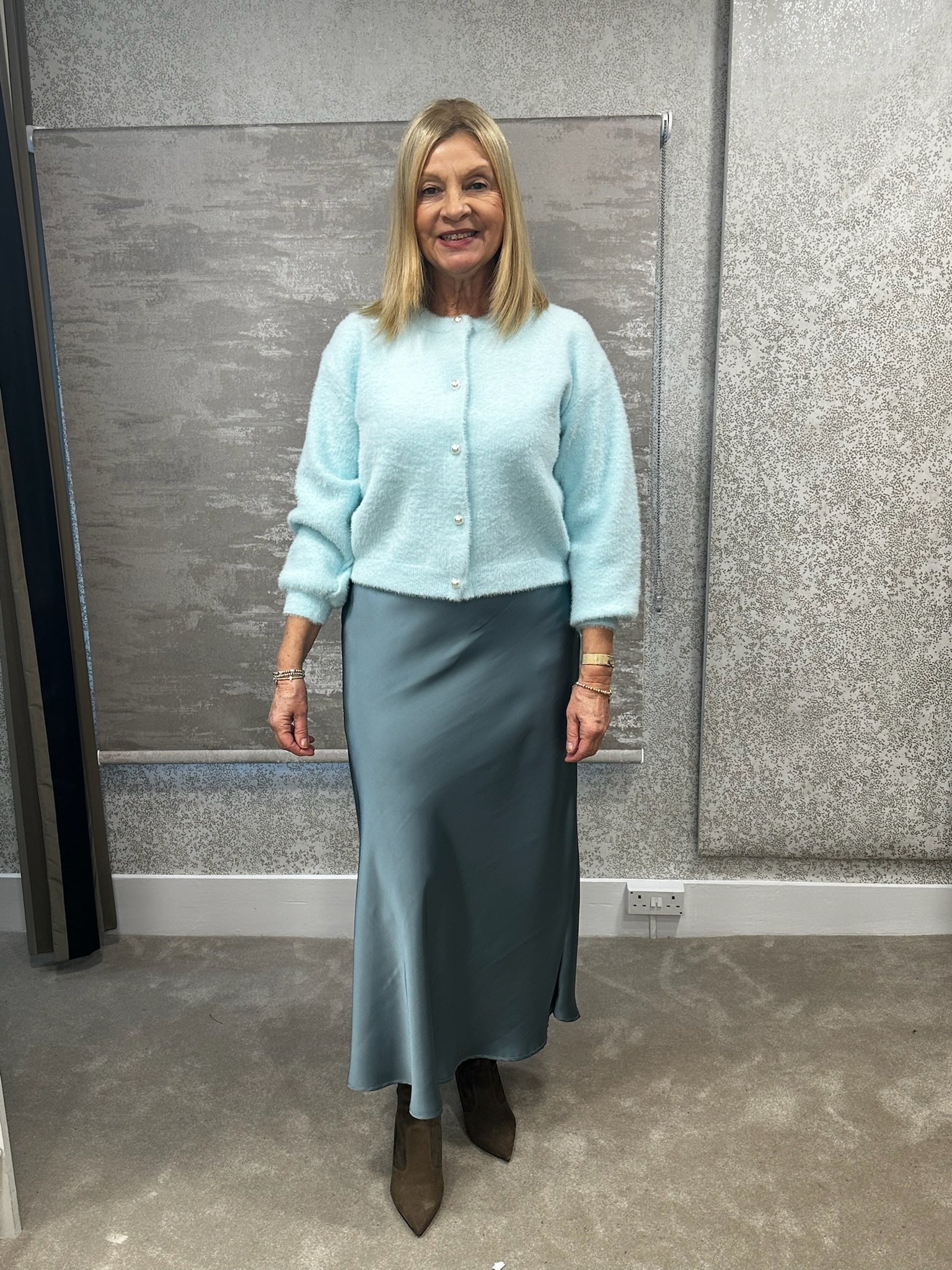 Indulge in luxury with our White Leaf Satin Skirt in Duck Egg. Made from 100% polyester, this elegant slip skirt will flatter your figure with its side waist concealed zip and elasticated waistband. Whether you dress it up with heels and a dressy top or dress it down with trainers and a cozy sweater, you'll exude effortless style.