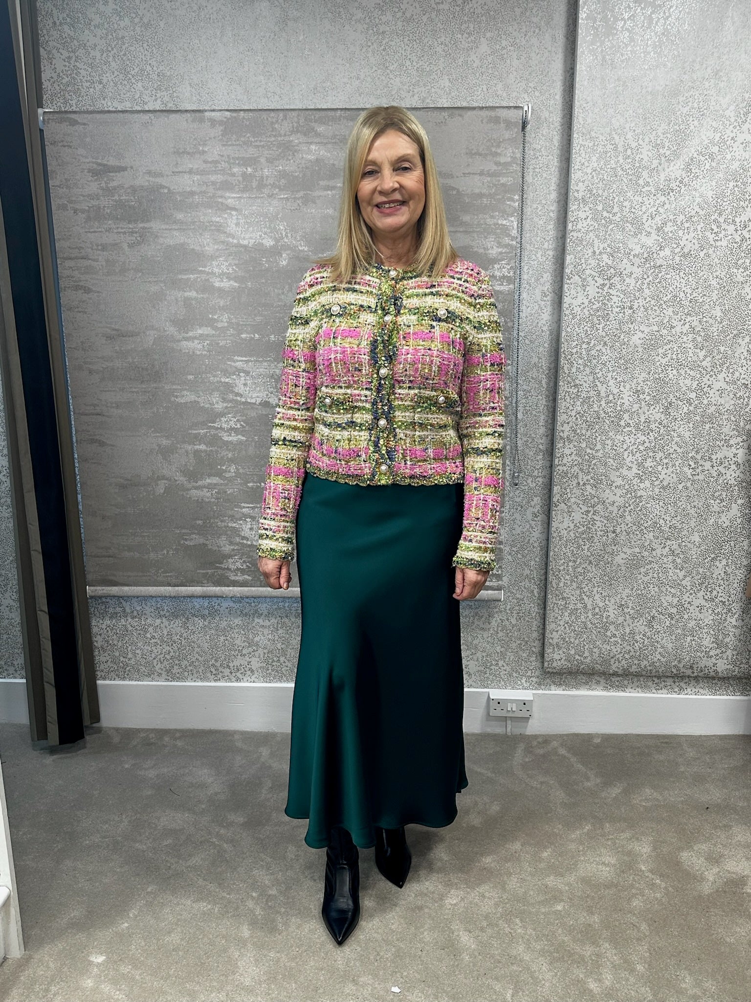Indulge in luxury with our White Leaf Satin Skirt in Forest Green. Made from 100% polyester, this elegant slip skirt will flatter your figure with its side waist concealed zip and elasticated waistband. Whether you dress it up with heels and a dressy top or dress it down with trainers and a cozy sweater, you'll exude effortless style.